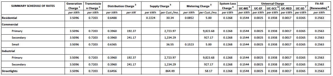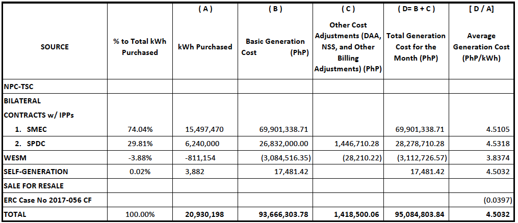 1. Changes every month based on the movement in generation cost in accordance with Article 2 Section 2 of ERC Resolution No. 16, Series of 2009, inclusive of adjustment as per ERC Case No. 2017-056 CF.